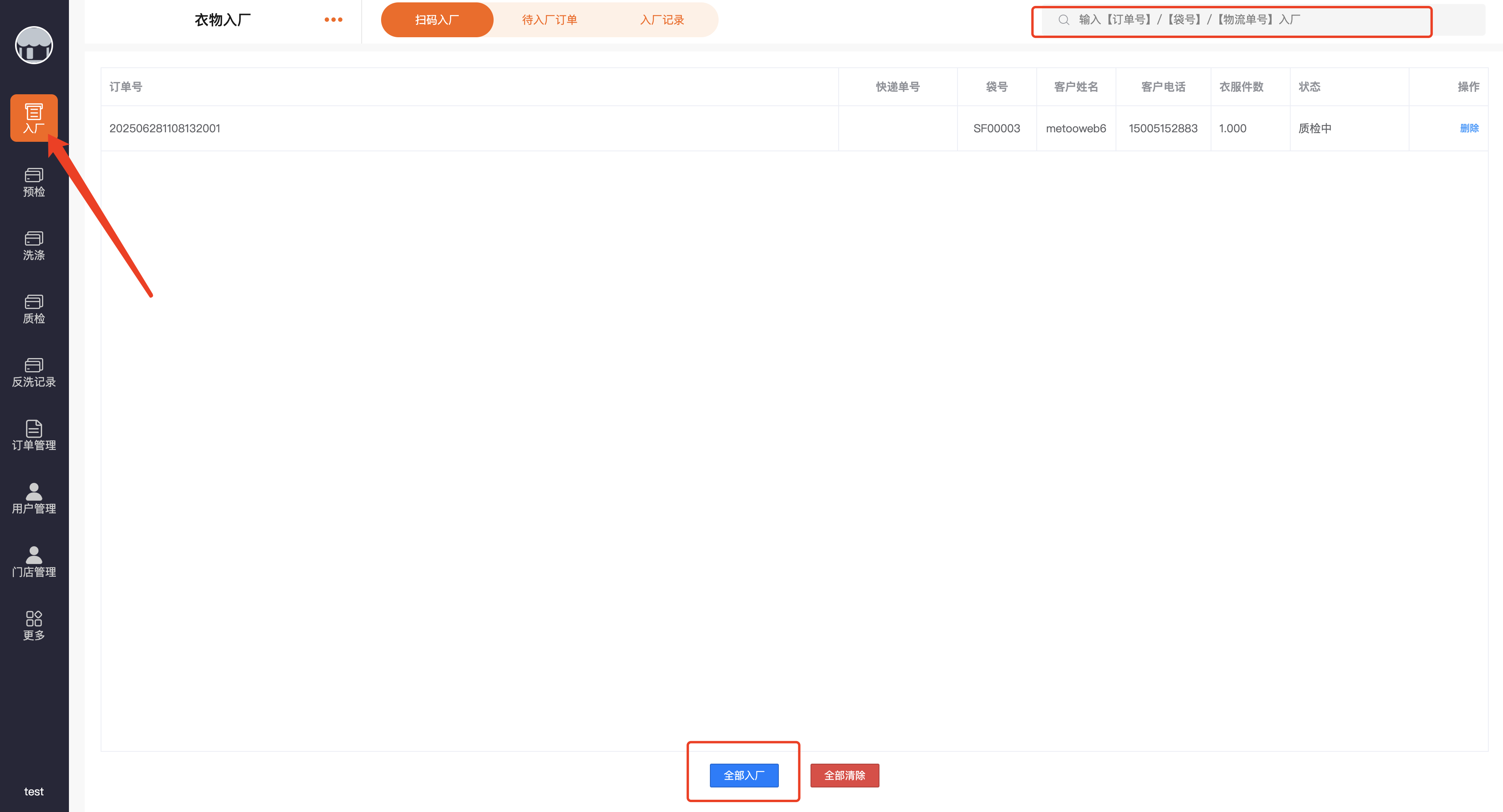 目录 搜索 展开 平台操作创建工厂管理门店洗护选项洗涤工序沟通类型洗衣袋号工厂操作工厂登录工厂设置员工设置工厂操作流程衣物入厂衣物预检衣物洗涤衣物质检取送员操作到店取件到厂签收衣物出厂到店确认门店操作抖音核销送洗到店确认门店收银产品管理收银开单次卡销售会员管理会员充值洗衣设置库位设置水洗唛设置合格证设置其他设置小程序核销抖音核销预检质检订单管理员工管理收银交班 暂无相关搜索结果! 阅读次数:18 本文档使用 MinDoc 发布 衣物入厂 光标置于右侧红框处,扫描袋号,点击下方全部入厂,执行入厂操作作者:admin 创建时间:2025-08-02 11:06最后编辑:admin 更新时间:2025-10-05 16:28